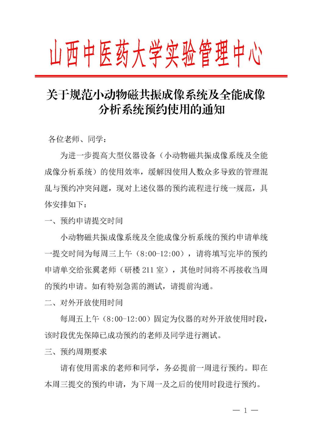 关于规范小动物磁共振成像系统及全能成像分析系统预约使用的通知